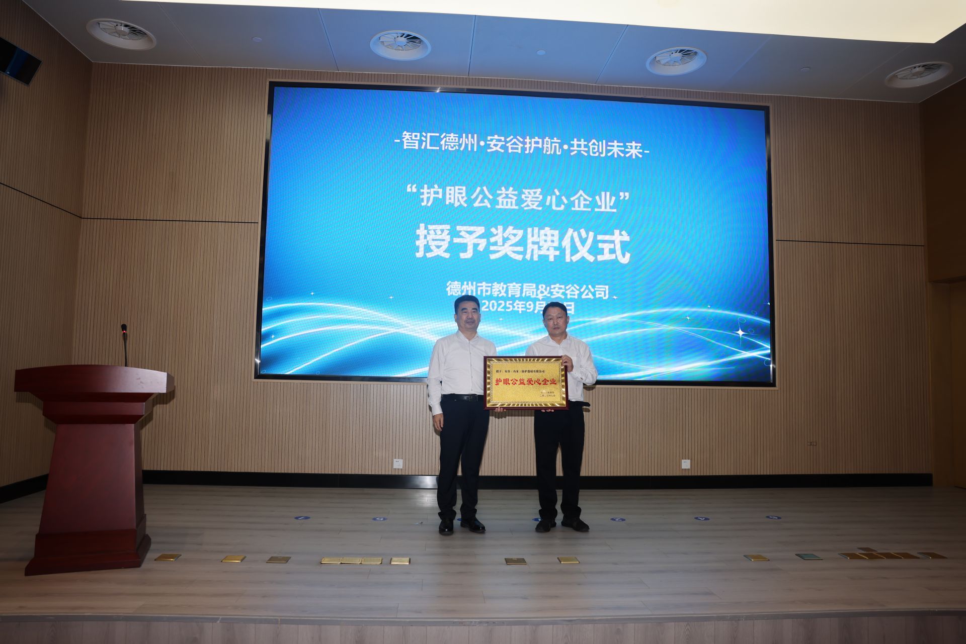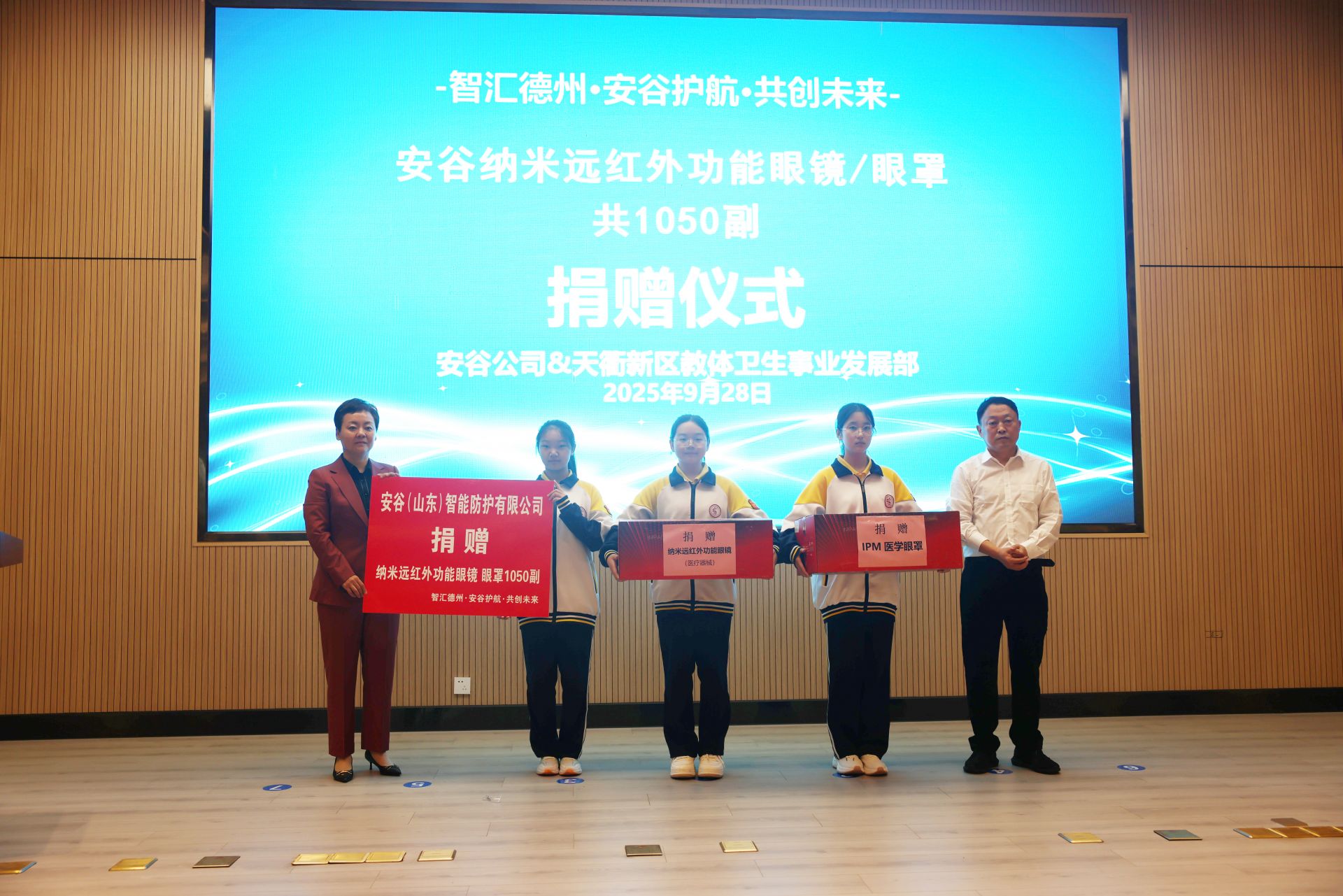 仪式上,佛山安谷新材料有限公司向德州市中小学生捐赠了总价值157.29万元的1050套纳米远红外功能眼镜和眼罩,安谷公司、德州文旅集团、天衢建设发展集团,三方签署战略合作协议,为共建的安谷智能防护联合实验室揭牌。