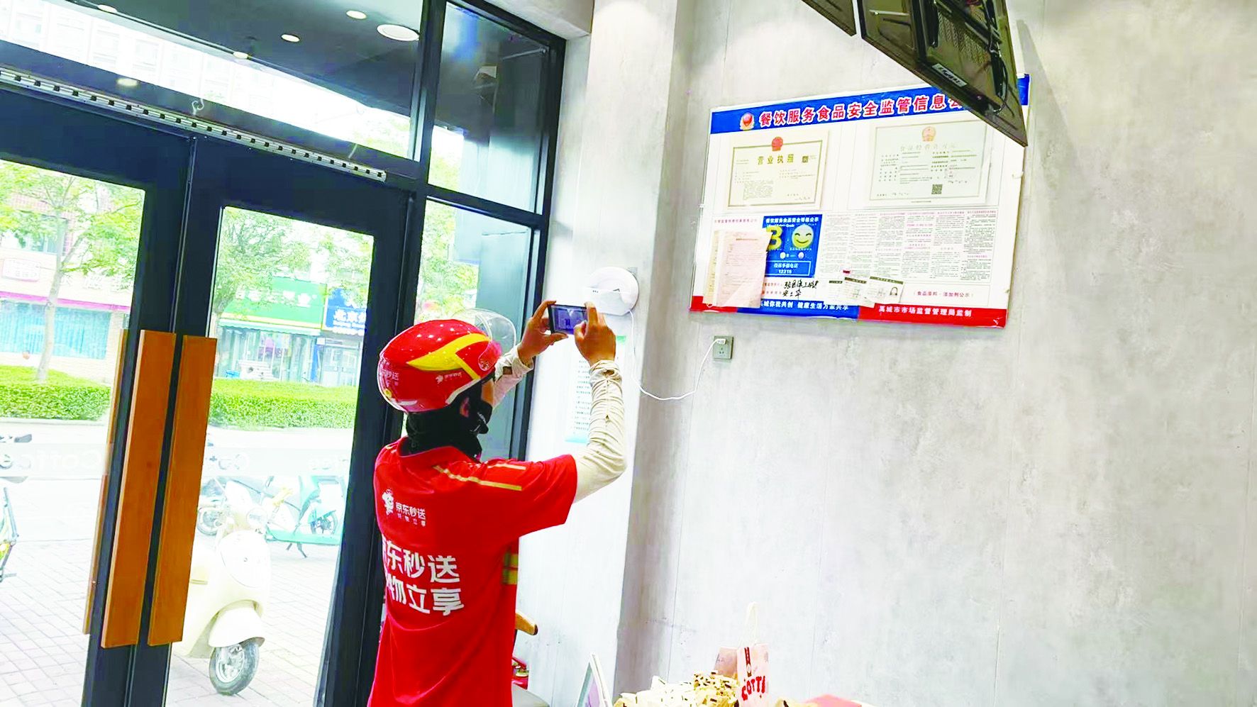 在禹城市通衢路一家早餐店,刘志龙仔细确认证照有效后,在“网络订餐违法线索随手拍(试用版)”专用小程序上标记“正常”;在一家麻辣烫店,他及时提醒员工规范佩戴发帽;发现煲仔饭外卖未贴封签,他主动用自己的备用封签帮忙贴上,并同步上报情况。下午,他还特意绕道去了瑜琳街路一家之前发现地面积水问题的面馆,直到确认整改合格后才放心。这一天,他在完成37单配送的同时,完成了15次食品安全检查,发出两次现场提醒,上报1个问题。