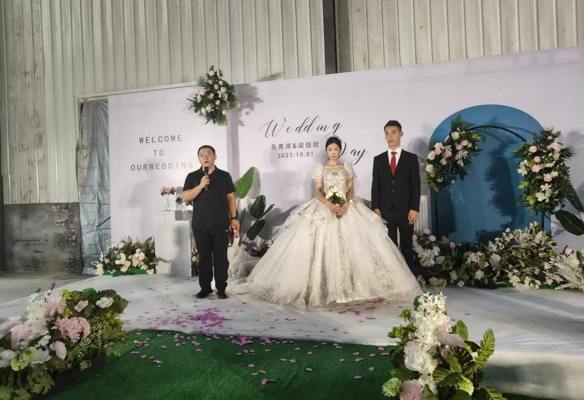 这场婚礼的“特别”,始于新人对“幸福”的别样理解。“不想被传统婚礼的‘面子工程’束缚,更想以轻松真实的方式分享幸福。”新人的这一想法,与岳集村长期倡导的文明新风不谋而合。得知新人不愿选择高端酒店办婚礼,村党支部书记岳可福主动提出将自家闲置库房免费提供给新人使用。经过新人精心装饰,原本朴素的库房变身喜庆温馨的婚礼场地,没有华丽布景,却处处透着烟火气与幸福感。