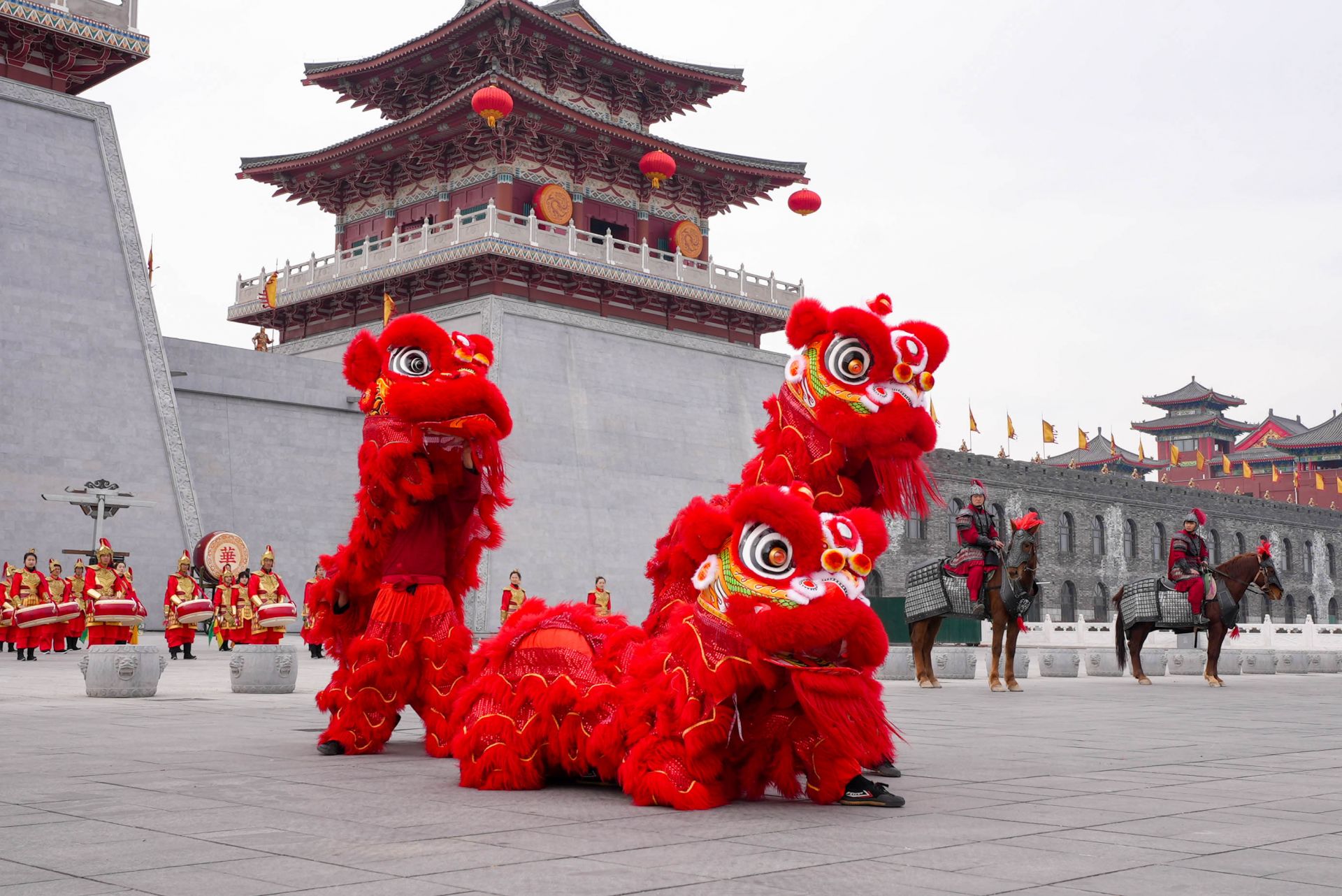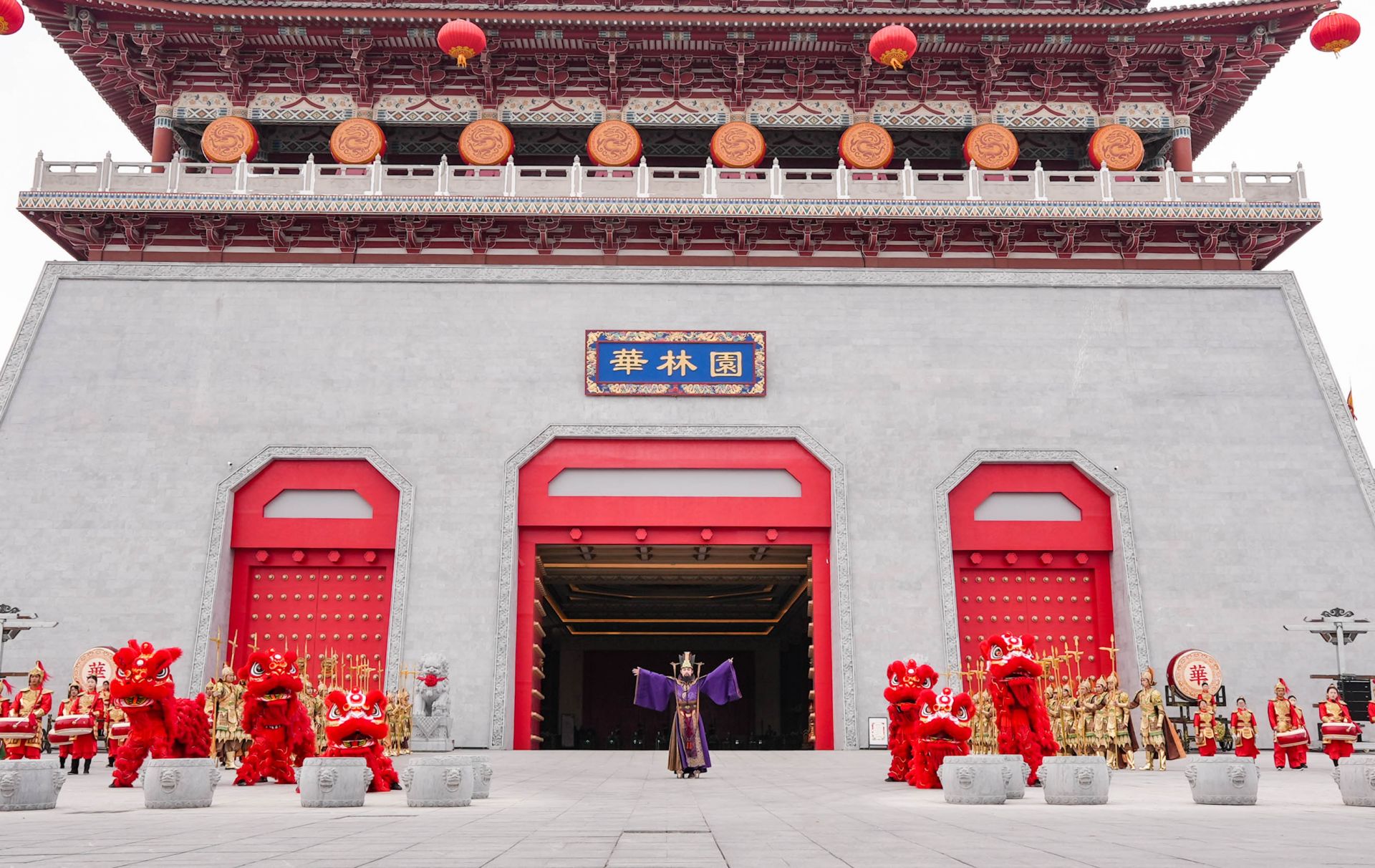 大年初一,在齐河欧乐堡度假区,华林园东门鼓乐震天、骏马列阵——130人的锣鼓队气势如虹,26匹骏马踏雪而来,身着非遗唐装的“金吾卫”与“宫女”肃立两旁,文言颂词朗朗回荡,一场复原唐代礼制的开城仪式,瞬间将游客带入千年盛景。