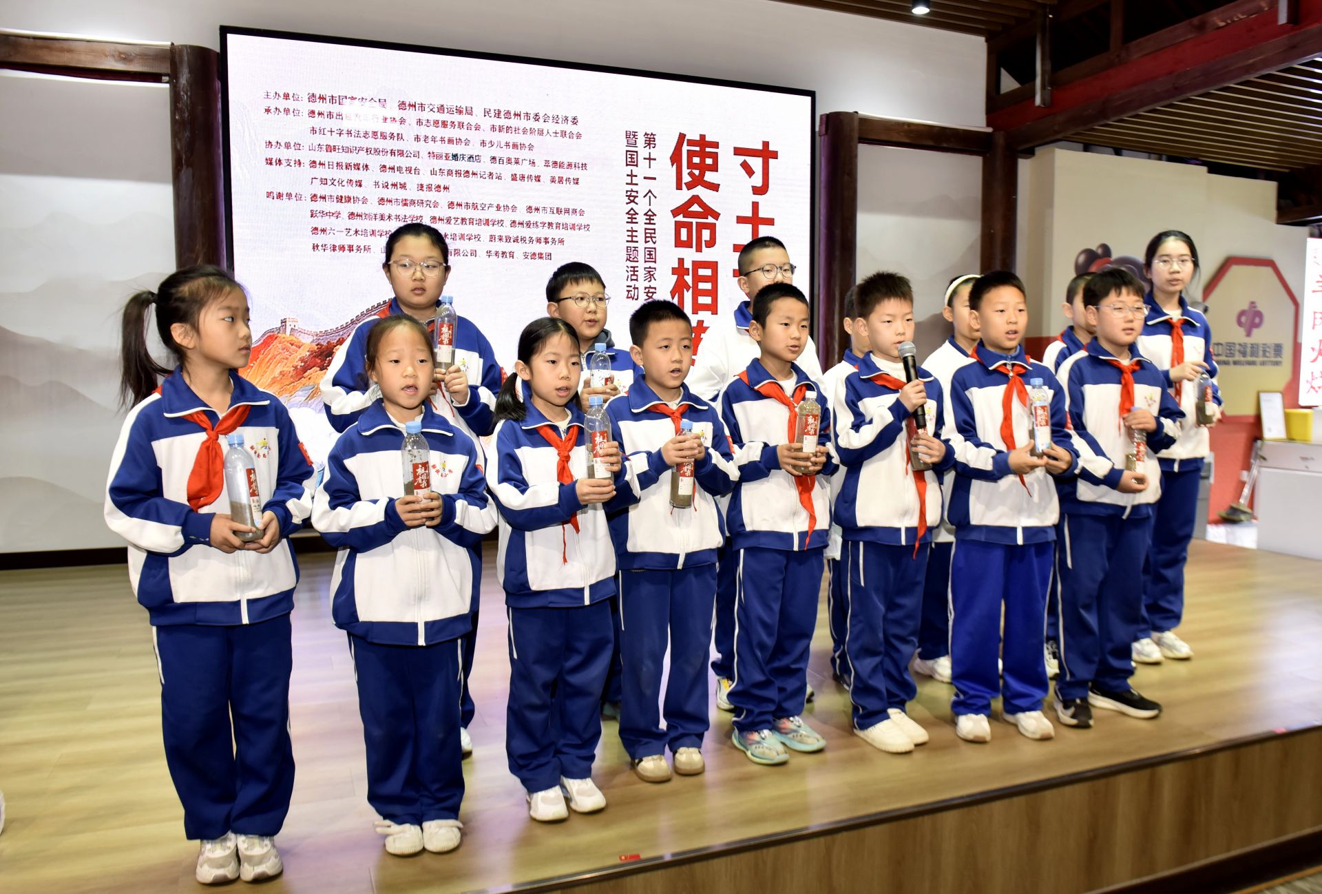 在“取土展示”环节,来自德州市少儿书画协会及解放南路小学的学生们集体登台。他们将象征国土的土瓶捧于胸前,齐声高喊“祖国有我,寸土寸安,使命相传”,以少年之声许下守护家国的庄严承诺,生动诠释了“少年强则国强”的深刻内涵。