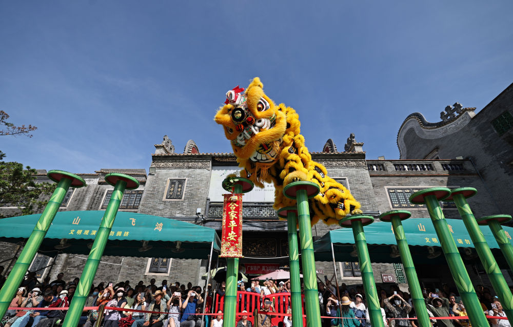 全运会让佛山醒狮大面积“圈粉”。黄飞鸿纪念馆前,佛山黄飞鸿中联醒狮队两头醒狮在高低绵延的桩柱上“闪转腾挪”,引来诸多游客阵阵叫好。