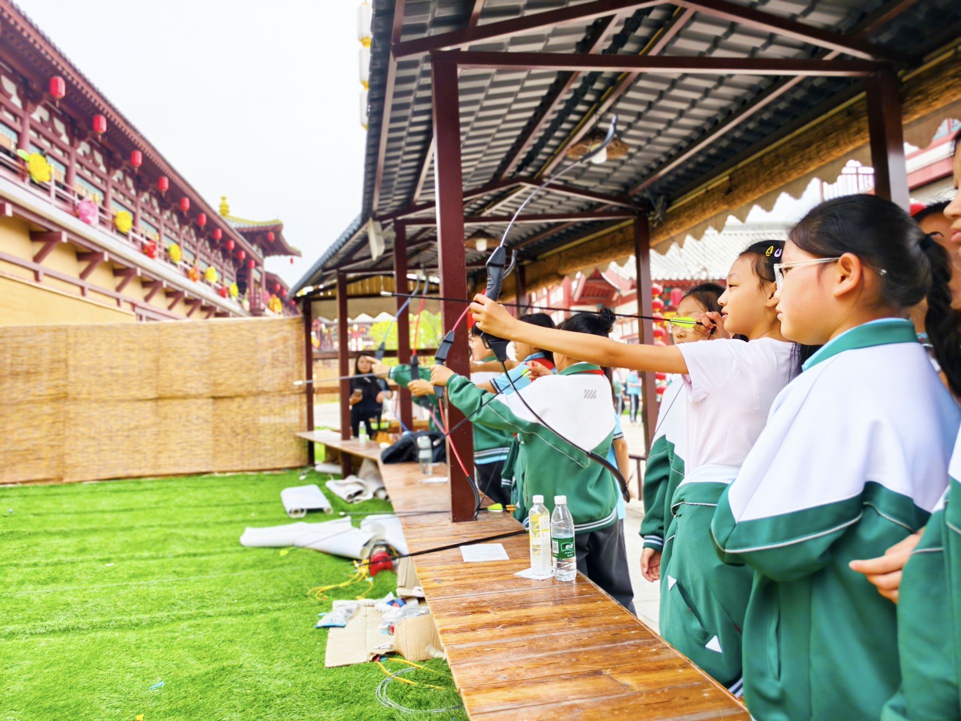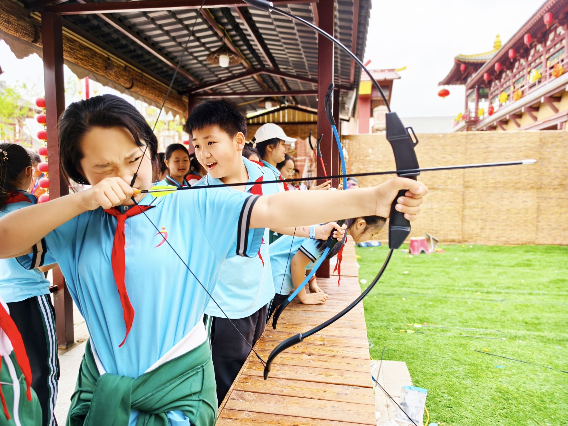 学生们走进乐陵影视城,参与射箭、投壶、猜谜语等丰富多彩的实践体验活动。孩子们在趣味互动中感受传统文化魅力,锻炼动手能力与团队协作意识,在轻松愉悦的氛围中拓宽视野、增长见识,实现了学思践悟、知行合一。
